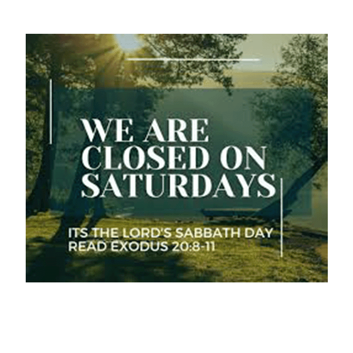 Thank you for visiting our site but we are currently closed for the Lords Weekly Sabbath. Please come back during our normal business days Sunday thru Friday-Sundown. Thanks for your Patronage, See You back Soon!